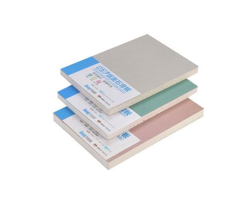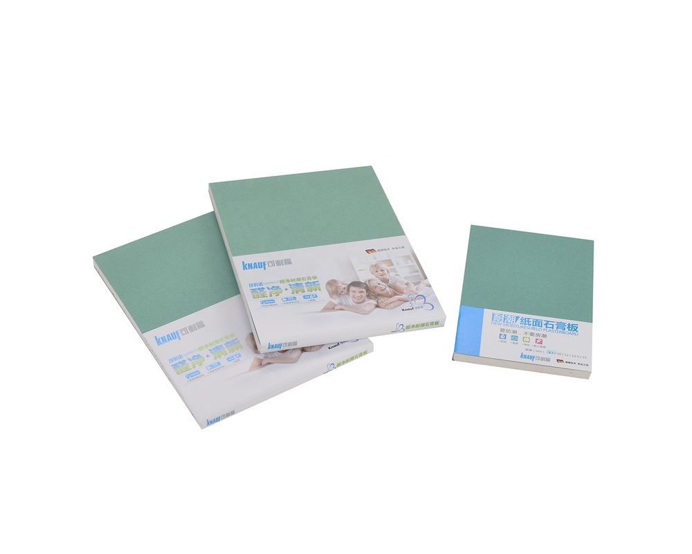 แผ่นยิปซัมกันน้ำโดยทั่วไปมีสีเขียวซึ่งแตกต่างจากแผ่นยิปซัมมาตรฐานสีเขียวมาจากสารเติมแต่งไม่ซับน้ำที่เติมระหว่างการผลิต